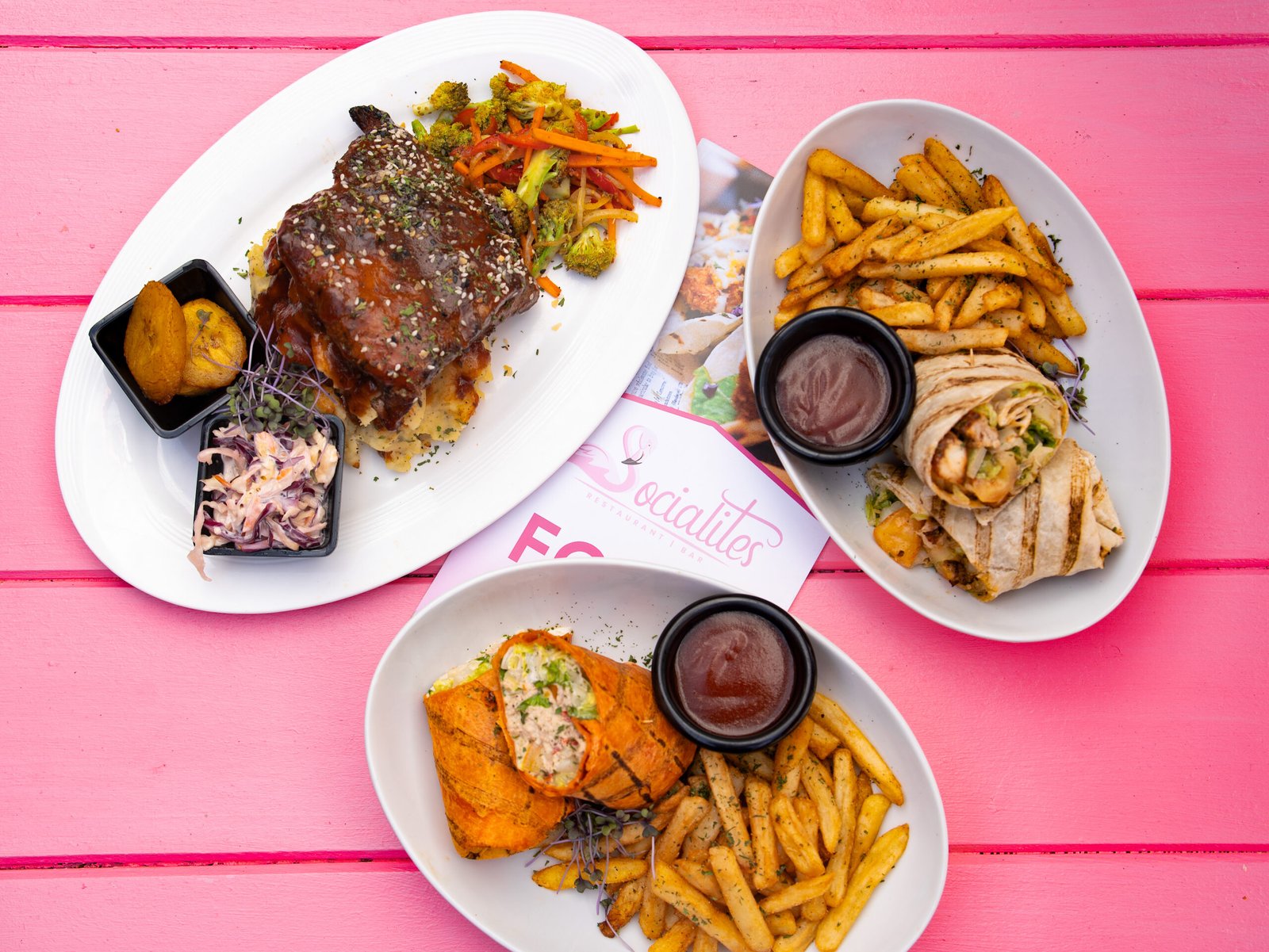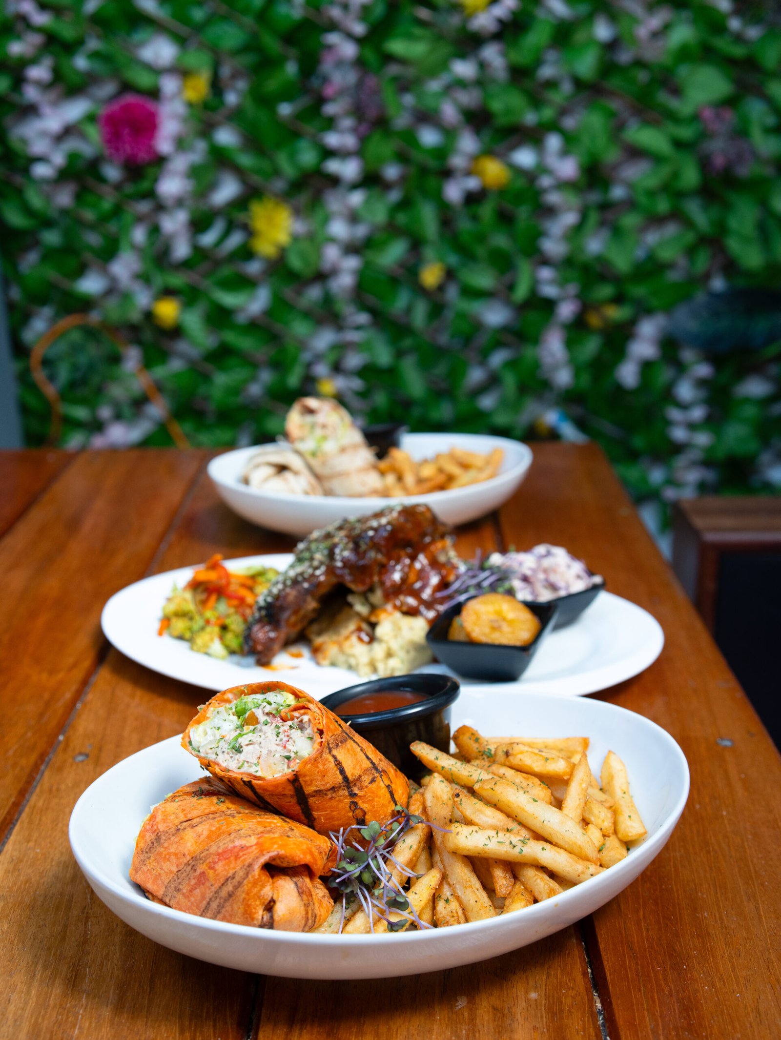 A hearty veggie burger topped with vegetarian cheese, sweet plantain, and traditional garnishes. Served with a side of golden fries.